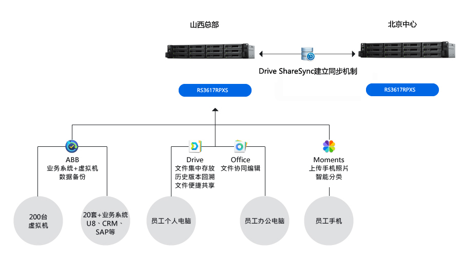 一份備份數(shù)據(jù)對公司的安全需求來說還不夠,借用群暉又進(jìn)一步打造了異地備份容災(zāi)方案。振東制藥山西總部的 RS3617RPXS 的備份數(shù)據(jù),通過群暉 Drive ShareSync多分點(diǎn)同步功能復(fù)制到北京分公司的 RS3617RPXS 中。支持排程備份計(jì)劃。