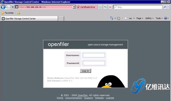 當(dāng) Openfiler 系統(tǒng)安裝并重啟完成后,對系統(tǒng)所有后續(xù)的配置過程,都是以 Web 方式配置完成的。這種全部基于 Web 的系統(tǒng)配置方式,使得配置過程變得更加簡易,同時也帶來了良好的用戶體驗。首先打開瀏覽器,輸入地址:https://IP:446。注意,此處輸入的 IP 地址為在系統(tǒng)安裝時所配置的固定 IP 地址。然后使用系統(tǒng)初始默認(rèn)的用戶名和密碼進行登陸。用戶名為 openfiler,密碼為 password。系統(tǒng)初始的用戶名和密碼可以在第一次登入系統(tǒng)后進行重新設(shè)置。如圖所示。