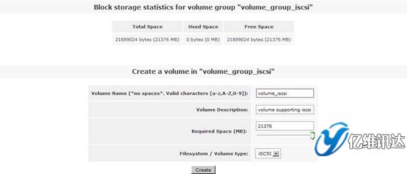 接著在右側(cè)的“Volumes section”區(qū)域選擇“Volume Groups”來創(chuàng)建一個卷組。在區(qū)域“Create a new volume group”處填寫卷組 volume group 的名稱為“volume_group_iscsi”,同時勾選剛剛在上一步所創(chuàng)建的物理卷 /dev/sda4,最后點擊“Add volume group”。如圖