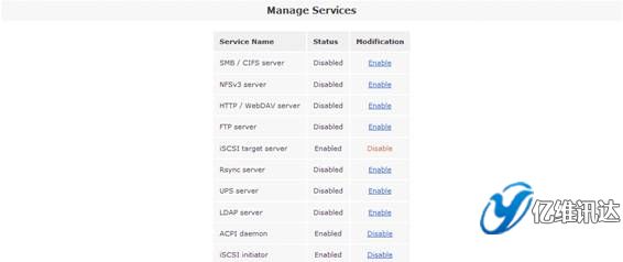 當(dāng) iSCSI 卷創(chuàng)建完成后,接下來是開啟“iSCSI target server”系統(tǒng)服務(wù)。點擊“Services”菜單,在右側(cè)的“Services section”區(qū)域選擇“Manage Services”。然后將系統(tǒng)服務(wù)列表中的“iSCSI target server”設(shè)置為“Enabled”狀態(tài),從而使得系統(tǒng)能夠?qū)ν馓峁┗?iSCSI 協(xié)議的虛擬存儲服務(wù)。如圖